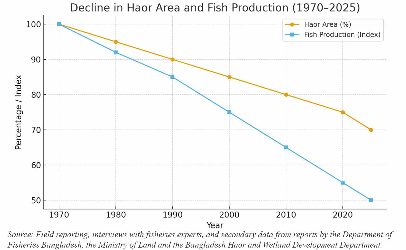 ভূমি মন্ত্রণালয়ের হিসাবে বাংলাদেশে গত ৫০ বছরে জলাভূমি কমেছে ৭০ শতাংশ। যা মাছ ও মিঠা পানির উৎস এবং জলজ উদ্ভিদ ও প্রাণবৈচিত্র্যের আবাসস্থল। কৃষিজমি কমেছে ৩০ শতাংশ। ভরাট, দখল, বসতি স্থাপন, শিল্পায়ন ও নগরায়নে হাওর-বিলগুলো অস্তিত্ব সংকটে, জীববৈচিত্র্য হুমকিতে পড়ছে। বন্যা, খরা ও জলবায়ূর প্রভাবে আক্রান্ত জলাভূমি। অন্যদিকে জনসংখ্যা বেড়েছে তিনগুণের কাছাকাছি। আশ্চর্যের বিষয়, জমি কমলেও চাহিদার সাথে পাল্লা দিয়ে বেড়েছে ধান ও বাণিজ্যিক খামারে মাছ উৎপাদন। তবে পরিবেশবিদরা সতর্ক করেছেন- মাছ চাষের এই সাফল্যের আড়ালে হাওরের মূল চরিত্র নষ্ট হয়ে যাবে!