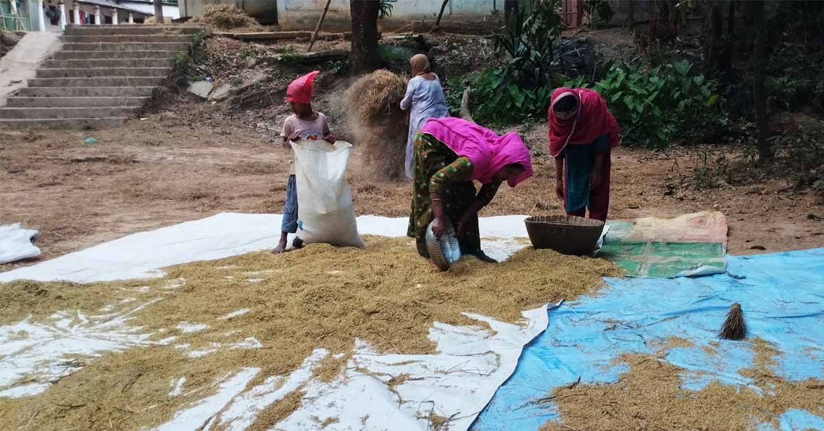 সিলেটের হাওরাঞ্চলে ধান ও খড় শুকাতে ব্যস্ত নারীরা। ছবি- হাসানাত কামাল
