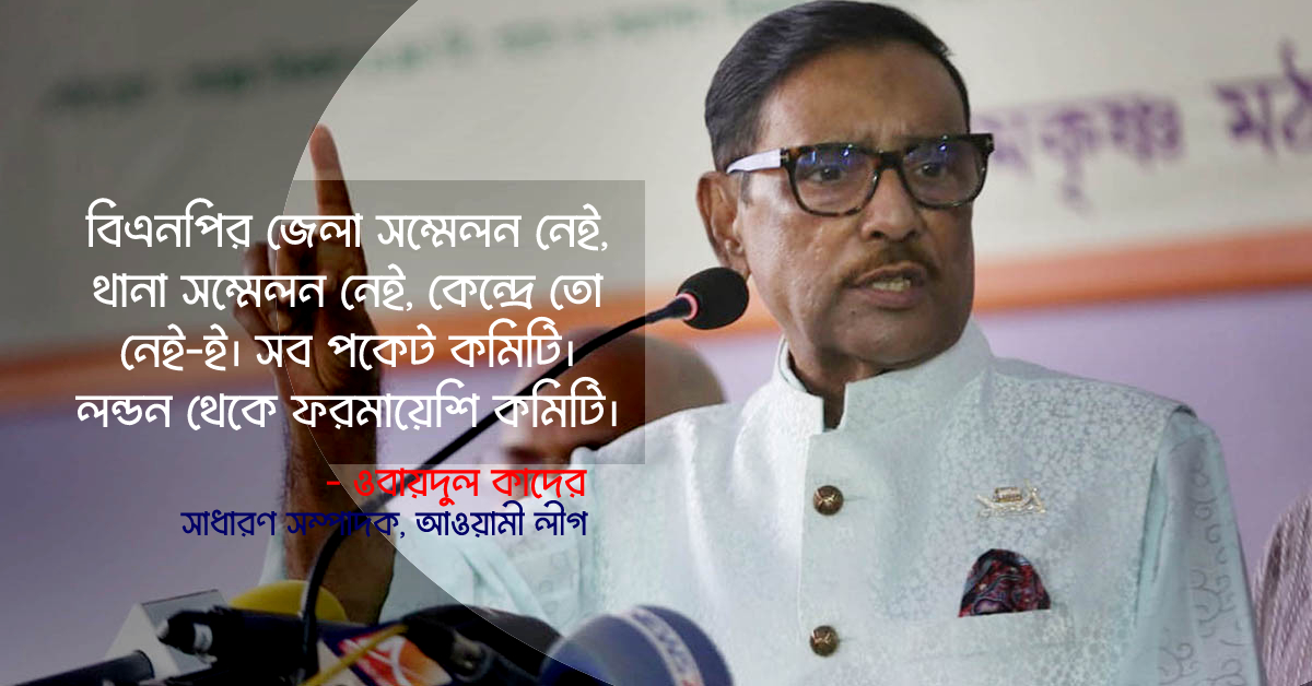 এসময় ওবায়দুল কাদের বলেন, আপনারা (বিএনপি) দলের গঠনতন্ত্র লঙ্ঘন করে ক্ষমতায় যাওয়ার পাঁয়তারা করছেন। আপনাদের এই দলের কোনো বৈধতা নেই। যাদের নিজেদের ঘরে গণতন্ত্র নেই তারা দেশে কীভাবে গণতন্ত্র প্রতিষ্ঠা করবে? তাদের কোনো সম্মেলন হয় না। জেলা সম্মেলন নেই, থানা সম্মেলন নেই, উপজেলায় নেই, কেন্দ্রে তো নেই-ই। সব পকেট কমিটি। লন্ডন থেকে ফরমায়েশি কমিটি। পকেট কমিটি দিয়ে বিএনপির টপ টু বটম চলে।