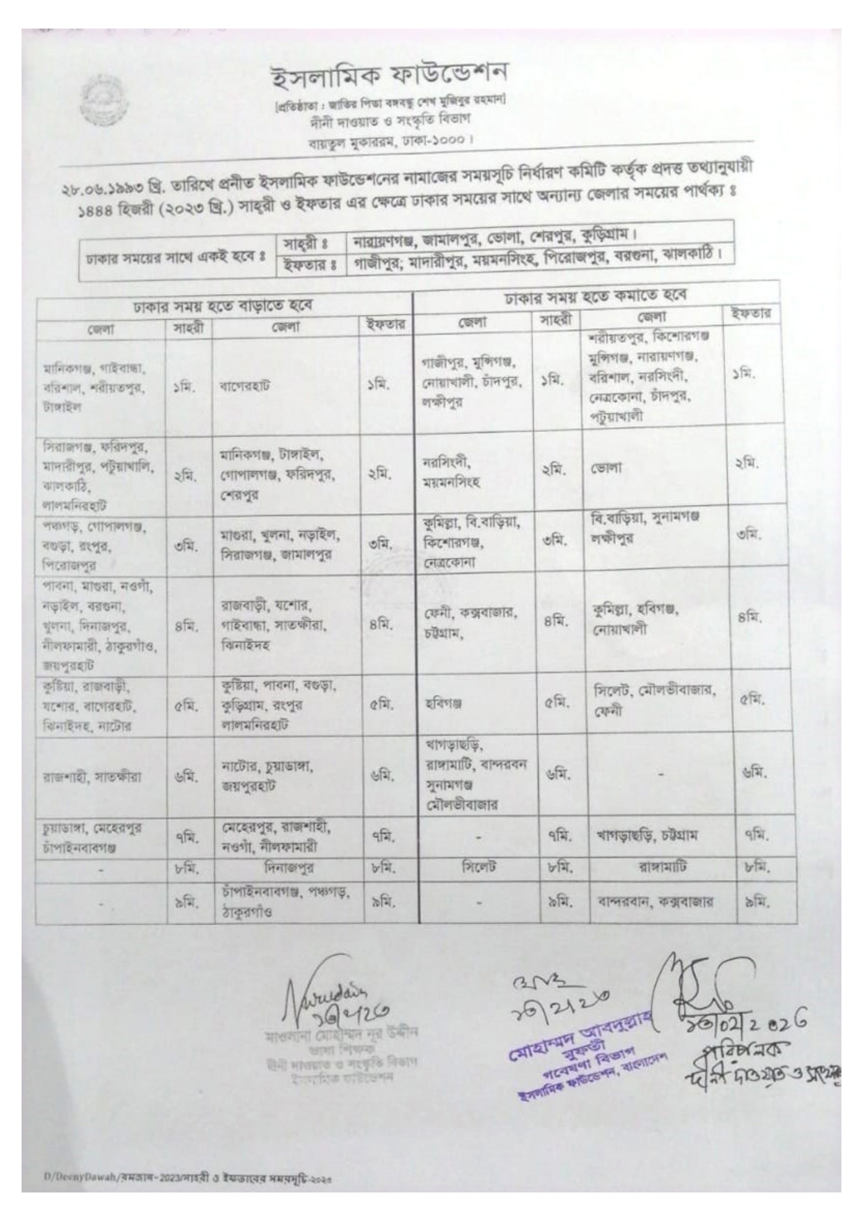 এ ছাড়া দেশের অন্যান্য বিভাগ ও জেলার সেহরি ও ইফতারের সময়সূচি ইসলামিক ফাউন্ডেশনের বিভাগীয় ও জেলা কার্যালয় থেকে প্রকাশ করা হবে।