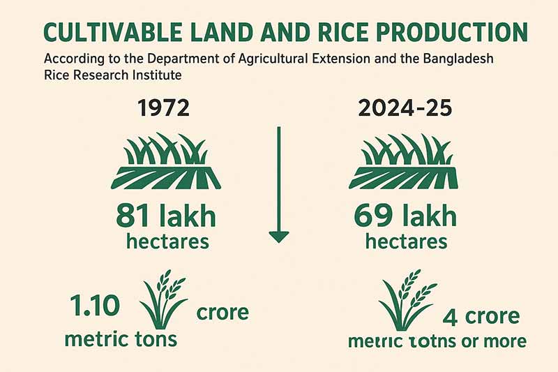 কৃষি সম্প্রসারণ অধিদফতর ও ধান গবেষণা ইনস্টিটিউটের তথ্যানুসারে- ১৯৭২ সালে বাংলাদেশে চাষযোগ্য জমির পরিমাণ ছিলো ৮১ লাখ হেক্টর। জনসংখ্যার চাপ, নগরায়ণ, বাড়িঘর ইত্যাদি অবকাঠামো নির্মাণসহ নানা কারণে সেটা ৩০ শতাংশ কমেছে। ২০২৪-২৫ সালে চাষযোগ্য জমির পরিমাণ এসে দাঁড়িয়েছে ৬৯ লাখ হেক্টরে। তখন ধান উৎপাদন হতো ১.১০ কোটি মেট্রিক টন। পঞ্চাশ বছর পর সেটা এখন উৎপাদন হচ্ছে ৪ কোটি মেট্রিক টনেরও বেশি। অর্থাৎ এই পরিসংখ্যান অনুযায়ী বাংলাদেশে চাষযোগ্য জমির পরিমাণ কমলেও বেড়েছে ধান উৎপাদন।