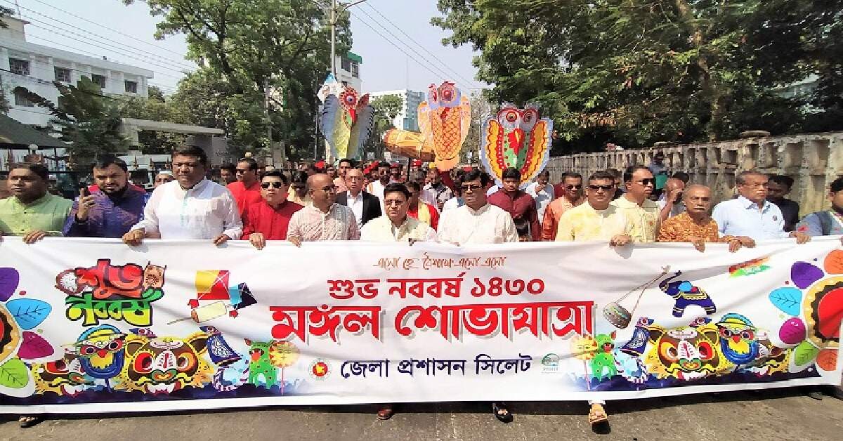শুক্রবার সকাল সাড়ে ৯টায় জেলা প্রশাসন প্রাঙ্গণ থেকে কড়া নিরাপত্তায় বর্ণাঢ্য মঙ্গল শোভাযাত্রার মধ্য দিয়ে সিলেটেও শুরু হয় নববর্ষের আনুষ্ঠানিকতা। এতে অংশ নেয় সিলেটের বিভিন্ন সামাজিক সাংস্কৃতিক সংগঠন, বিভিন্ন শিক্ষাপ্রতিষ্ঠান এবং প্রশাসনের কর্মকর্তা কর্মচারীরা।