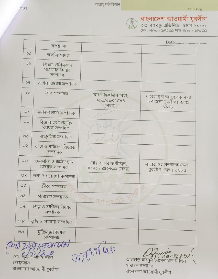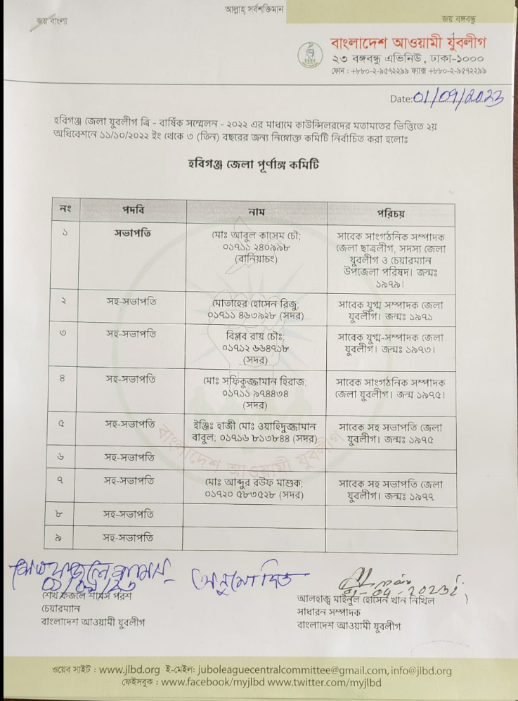 হবিগঞ্জ জেলা যুবলীগের কমিটি ঘোষণা