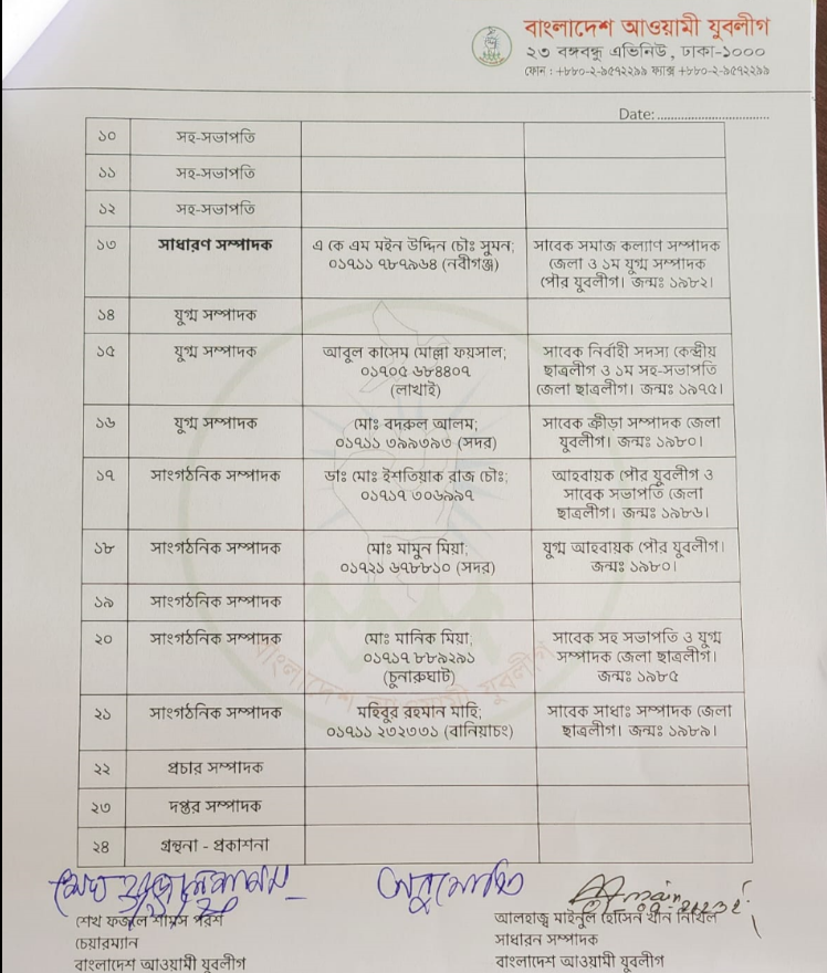 মো. আবুল কাসেম চৌধুরীকে সভাপতি ও এ কে এম মইন উদ্দিন চৌধুরী সুমনকে সাধারণ সম্পাদক করা হয়েছে হবিগঞ্জ জেলা যুবলীগের।