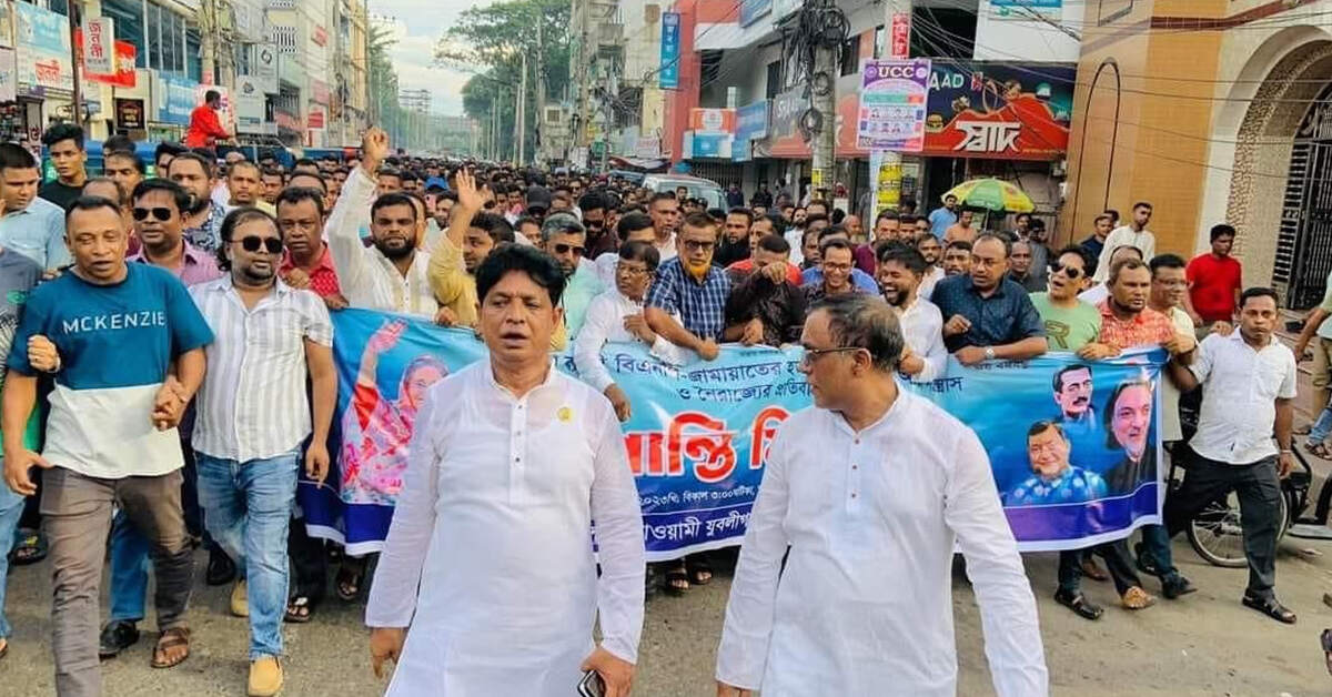 বুধবার (৬ সেপ্টেম্বর) বিকেলে স্থানীয় কেন্দ্রীয় শহীদ মিনার প্রাঙ্গণ থেকে শান্তি মিছিল বের হয়ে শহরের গুরুত্বপূর্ণ সড়ক প্রদক্ষিণ করে।মিছিল শেষে শহরের এস আর প্লাজার সামনে এক শান্তি সমাবেশ অনুষ্ঠিত হয়। এর আগে খন্ড খন্ড মিছিল বিভিন্ন এলাকা থেকে নিয়ে আসেন নেতা কর্মীরা।
