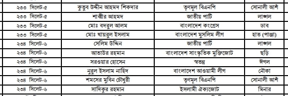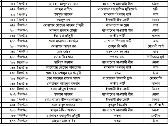 সিলেট বিভাগে প্রার্থীদের তালিকা