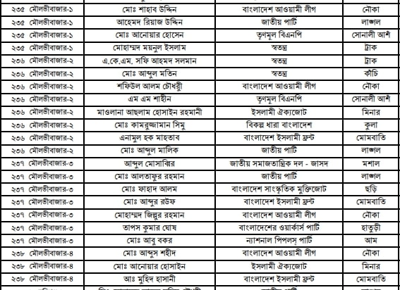 মৌলভীবাজার জেলার প্রার্থীদের তালিকা | মার্কা | দলের নাম