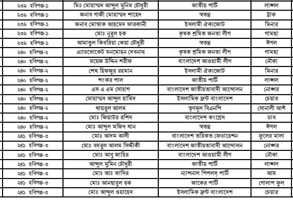 হবিগঞ্জ জেলার প্রার্থীদের তালিকা | মার্কা | দলের নাম